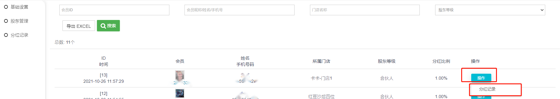 可按门店、奖励时间筛选对应的门店股东分红,可导出excel
