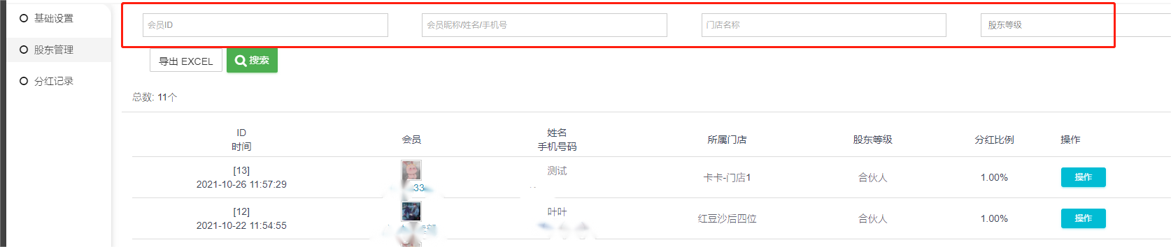 ⑤可通过会员id/昵称/姓名/手机号、股东等级进行筛选