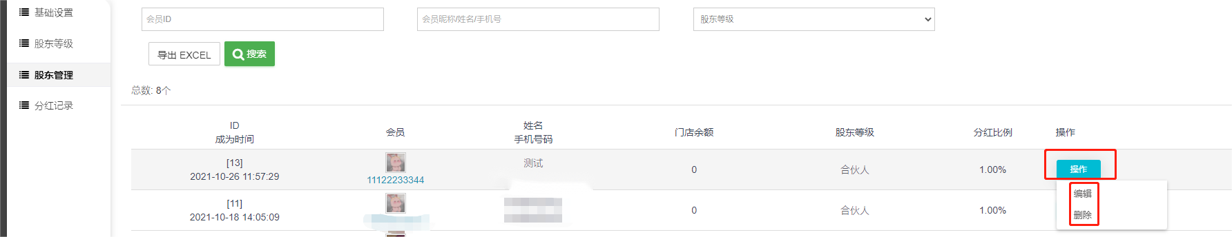 ③在该列表可查看到股东的id、成为时间、股东会员信息、股东等级、分红比例